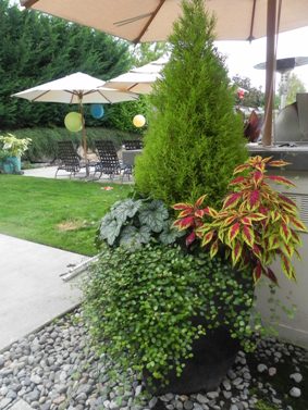 Lime cypress and wire vine container planting